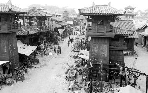 新造出來的一條街已經被《木乃伊3》折騰得滿目瘡痍,到處都是斷壁殘垣,滿地爛瓦以及火燒過的痕跡,兩邊的店鋪和房子都已經半倒塌,滿地的戰爭遺跡幾乎達到了讓人難以插腳的地步,最為壯觀的是街道盡頭的城門樓子,正面已經全部被箭矢所覆蓋,滿地都是攻城用的圓木,還有兩輛攻城戰車也豎立其中。城墻上,一名老外劇組人員正在加固攻城的云梯,城樓上擺滿了點火用的丙烷桶。