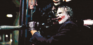 對于希斯·萊杰的加盟,外界普遍認為他比前任小丑的扮演者杰克·尼科爾森更具看頭。果然首段預告片中他的表現就令人十分驚艷。故事講述葛咸城出現一位自稱小丑的瘋狂罪犯,利用大殺傷力武器搶劫銀行,令警方束手無策,驚動蝙蝠俠出手相助,最后被捕入獄。出獄后的小丑公然向蝙蝠俠挑戰,片中有不少兩人街頭對決和他亂槍掃射的場面,正邪之戰最終演變成私人恩怨。而扮演小丑的希斯·萊杰無論舉手投足,甚至說話聲線均邪氣十足,配上其恐怖化妝及歇斯底里的笑聲,實在叫人不寒而栗。片中小丑一句口頭禪“Why So Serious?”(何需如此認真?),更成為了新一批電影海報的標語。