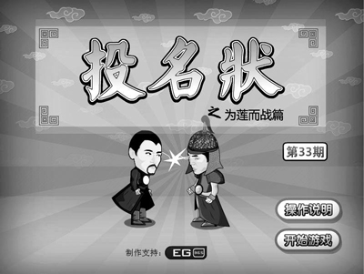 而互動惡搞《投名狀》的游戲也很有趣,就是趙二虎發現自己夫人蓮生和龐青云有染,為了挽回男人的尊嚴,他只有靠武力來證明自己是最強的,請參與游戲者幫趙二虎來挑戰龐青云。而游戲規則就是使用控制鍵,控制趙二虎挑戰龐青云,在規定時間內打敗龐青云即告勝利。在熟悉了游戲規則之后,此類惡搞并無難度系數。勝者王敗者寇,如果輸了,趙二虎會慚愧跪地說:“為什么我會輸?我才是元配。”而龐青云則會摟著蓮生說:“我是唯一的選擇,請支持壹基金。”結果令人忍俊不禁。