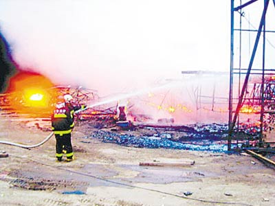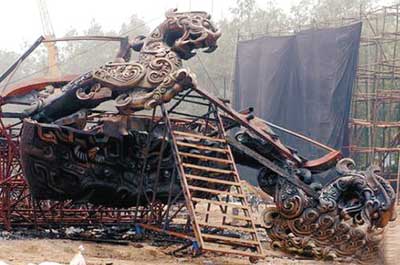 9日凌晨3時許,《赤壁》劇組在北京小湯山國家農(nóng)業(yè)科技園內(nèi)拍攝時發(fā)生火災(zāi)。目擊者稱,現(xiàn)場被燒毀的兩艘仿古戰(zhàn)船只剩下鐵骨架,另有一艘約12米長的道具船船頭損毀,場地上搭建的背景綠屏也燒毀了一大半。