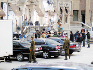 記者與現場演員聊天時,一些健談的群眾演員告訴記者,他們早晨化妝用了很長時間,男演員由于要扮演打仗時期的軍人,所以臉上的皮膚都是古銅色的,這樣他們在化妝時就需要在臉上涂一層很厚的深色粉底,就連手上也要涂,一個演軍官的演員把袖子挽起,對記者說:“你看,現在的化妝技術多好,我的臉和手卸了妝皮膚很白。”記者一看果然他的臉和手真的與胳膊是兩種顏色,但是這個顏色很自然一點都看不出是被涂上去的。一個演軍官的群演對記者說,他自從化完妝,就不敢笑,因為臉上的妝實在很厚,一笑就會出現很多紋路,為了不用經常補妝,他就克制著不讓自己笑。