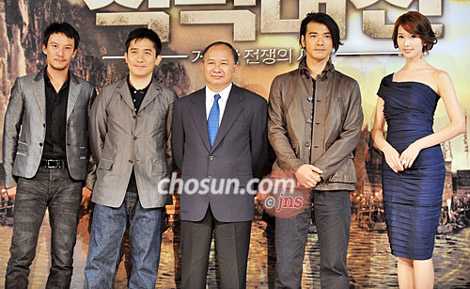 新片《赤壁》的主演梁朝偉、金城武、林志玲和導(dǎo)演吳宇森在首爾廣壯洞華克山莊酒店舉行了記者會(huì)。