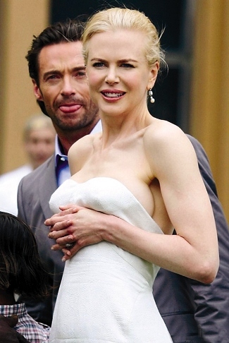 也許是太過放松,妮可·基德曼在向影迷們揮手致意的時候,身上穿的白色露肩晚禮服竟然悄然下滑,令其胸部走光,她驚覺后趕緊雙手護胸。