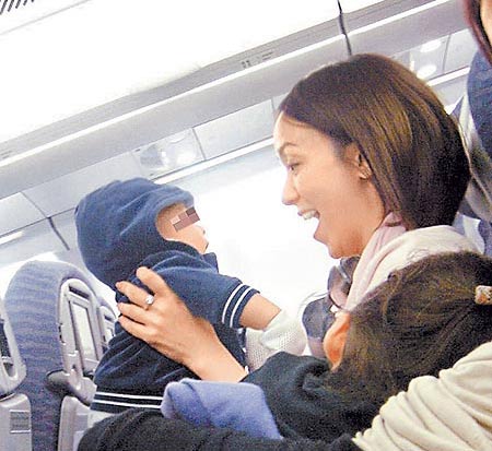 季芹(右)在飛機(jī)上笑著逗哄兒子YaYa。