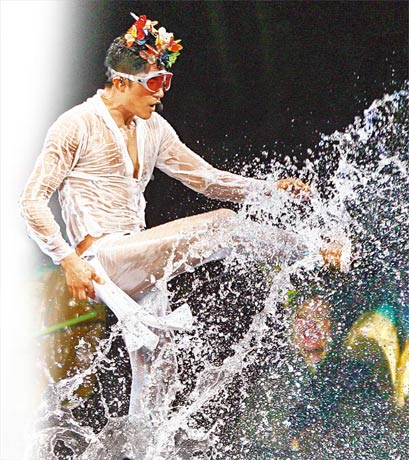 郭富城在演唱會(huì)濕身半裸,腳濺水花。
