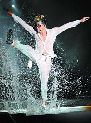 作為系列演唱會的保留項目,這次水花舞林表演環(huán)節(jié)賦予不少新的東西,首先是首次在T臺上表演,更加拉近與觀眾的距離;其次是前晚的氣溫只有10℃,在如此低溫的環(huán)境下“玩水”會令人更加興奮。在緩緩的流水聲中,整個舞臺被注滿了水,像一個巨型水池。在《唱這歌》的音樂聲中,身穿白色全套透視裝的郭富城現(xiàn)身跳起勁舞,水花一直濺射到臺下,觀眾也很興奮地迎水而舞,郭富城的紅色防水內褲也都完全展露出來,盡顯誘惑味道。而最后演唱《著迷》的時候,郭富城更用毛巾拍打舞臺的水,產生更多水花,將觀眾的熱情推向高潮。