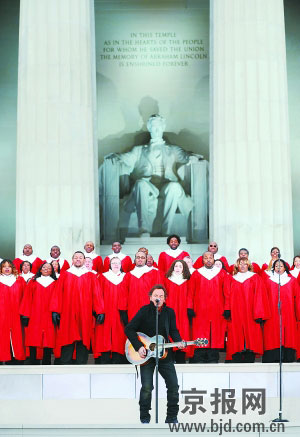 北京時間今天凌晨(當地時間1月18日下午),即將上任的美國新一任總統奧巴馬的就職音樂會在華盛頓林肯紀念堂前舉行。碧昂斯、博諾、布魯斯·斯普林斯汀、丹澤爾·華盛頓和湯姆·漢克斯等一線演藝明星到場助陣。