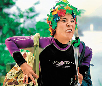中新網1月20日電 谷德昭執導、古天樂與鄭中基等主演的《家有喜事2009》上周五在香港上映,現已60歲的黃百鳴在戲中打算約吳君如一起游泳,練六塊腹肌上陣,一心以為君如會穿三點式赴會,豈料君如穿著潛水衣赴約。