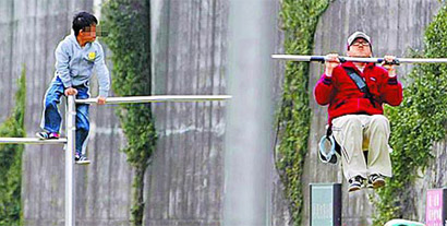 伊哈一家三口年初三到北海道團聚,之后悄悄返臺,據說這次碰面是解決家務事,昨下午記者目擊哈林帶哈利到大佳河濱公園,好動的哈利一下車就直沖單杠,掛在杠子上蕩來蕩去,身手矯捷。哈林不時比手畫腳指導哈利如何使力,還童心未泯走到較高的單杠前大手一拉,吃力地拉了3下。隨后哈林抱起哈利教他爬樹,父子親近大自然玩得忘我。