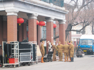 除了道具和布景以外,另一邊演員和造型師也忙得不可開交,記者在現場看到,造型師正一遍又一遍地檢查著各位演員的服飾和妝容,并且還要對每一雙鞋進行做舊處理,以達到最佳拍攝效果。當看到幾位群眾演員的軍裝領口,露出不符合時代背景的內衣后,就立刻要求他們脫下。記者看到,就連每一位群演的化妝也都細致入微,有的因為要調整膚色將粉底涂至脖子根部,有的被化妝師在臉上做出了好似疤痕的效果,更有甚者,因為發型不符合電影故事發生年代,竟被發型師當場剃成“板寸”。記者在現場還看到幾位候場的日本演員,敬業的他們在開拍前很久便開始對著鏡子反復練習。