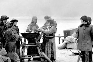 記者昨日在現場看到,每當拍戲的間歇,演員們就三五成群地圍到行軍火盆旁邊烤火、聊天。還有的演員扭在一起摔跤,以運動來增加熱量。