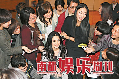 展貿(mào)廳里臨時(shí)隔開(kāi)的后臺(tái),早對(duì)明星見(jiàn)慣不怪的香港娛記圍攏在一起,為了等一下阿嬌過(guò)來(lái)接受采訪坐的一張椅子面朝哪邊、距離多遠(yuǎn),忽然爭(zhēng)吵起來(lái)。