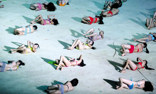“印象沙灘”是整場演出中最“養(yǎng)眼”的一幕。剛開始,兩個穿著短裙的姑娘跑到舞臺中央,一陣狂舞之后,兩人突然豪放地當著全場觀眾的面,脫下短裙,露出性感的三點式泳衣。觀眾還來不及驚呼,更多的三點式美女出現(xiàn)了,先是十幾個,后來是上百個……滿場都是!她們朝著觀眾席大喊:“我們是海南島的姑娘!我們很年輕!我們很漂亮!” ……