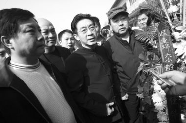 上午10點告別儀式開始,人們排成長隊井然有序地進入靈堂。閆懷禮的遺體安臥在花叢中,面容安詳。“神魂離去芳名百世著清風,音容宛在勤奮一生傳佳話”的挽聯十分醒目。靈柩旁,六小齡童、遲重瑞、馬德華等《西游記》主創垂淚站立。當《西游記》主題曲《敢問路在何方》在靈堂響起,眾人嗚咽聲一片。