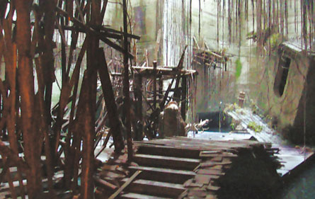 洞內燈火通明,卻很陰冷潮濕,時不時聽到滴滴答答的水聲,十幾個工人正在忙碌著趕制道具。一位工人師傅告訴記者,“我們已經在這里忙活兩個月了,洞內的所有木頭橋、破房子、還有垂掛下來的藤條等等,全是人工打造的!