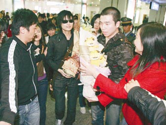 原本21:15落地的航班,最后21:51分才抵達。當身著黑色衣服的李宇春出現在普通通道時,現場沸騰了。負責組織的人手中拿著擴音器,一邊維持秩序,一邊帶領“玉米”們喊口號:“李宇春,重慶的。”(李宇春新專輯名叫《我的》)聲勢之大,引來了眾多路人觀看。記者采訪了解到,為了迎接李宇春,許多“玉米”從下午就趕來機場等候,晚飯都沒吃。一歌迷看到李宇春后,激動地給朋友打電話:看到了,好乖啊!李宇春雖然對歌迷保持著微笑,但還沒來得及打招呼,就在兩名助理的簇擁下鉆進了早已等候在旁的商務車,前后不到1分鐘時間。