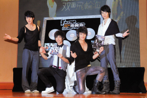 超人氣組合飛輪海將于今天全亞洲發(fā)行他們的第二張專輯《雙面飛輪!,昨日他們赴香港舉行亞洲記者會(huì)招待會(huì)。雖然人氣超高,但他們?yōu)榱诉@張新專輯的宣傳依然非常賣力,連一向惜肉如金的吳尊也來了一個(gè)“胸”前大解放,以透視裝露點(diǎn)出席記者會(huì)。