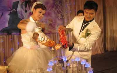 葉一茜是個(gè)從來(lái)不會(huì)關(guān)心體育的女生,雖然早就知道"跳水的田亮",可是從來(lái)沒(méi)有通過(guò)任何方式看過(guò)他"跳水"。一次兩人游泳,葉一茜要求田亮給她從十米臺(tái)跳個(gè)漂亮的可以拿金牌的動(dòng)作,田亮順口說(shuō)"嫁給我做老婆,就跳給你看"。葉一茜也很爽快地答應(yīng)了。這個(gè)"交易"就成為他們的"求婚儀式"。