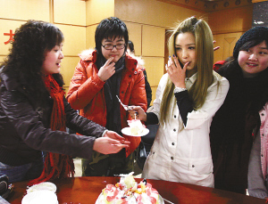 一位從事幼教工作的“盒飯”說很喜歡熱舞《BOYS》,閑暇還教小朋友們跳,何潔立刻調(diào)皮地說:“不會(huì)帶壞小孩子吧。”為慰問偶像,粉絲們還專門定制了印有何潔頭像的奶油蛋糕,可惜何潔怕破壞瘦身計(jì)劃,不敢品嘗。但為安慰粉絲,她還是親自切開蛋糕,分給大家大快朵頤。