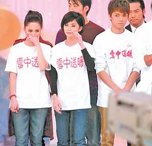 在前晚的無線直播特別節目《雪中送暖》中,阿嬌也受邀參加,除與“校長”譚詠麟等人合唱賑災主題曲《雪中送暖》外,阿嬌和阿SA還獲得了單獨表演的機會。