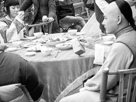 “這是我們的主菜掌上明珠。”趁著拍戲的空檔,演“金寶”的英俊小生邱心志當起了“跑堂”,給記者介紹起菜來。戲中的明爭暗斗都在餐桌旁,于是,這桌菜成了重要的道具。記者發現,這些菜還是實打實的真菜。在這桌菜邊上一坐幾個小時,還不能動筷子,無聊時,邱心志就把戲里的另一個道具——裝印章的盒子放在桌子上來回玩耍,像個雜技演員。