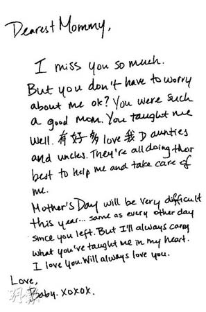 無(wú)法要求肥姐再做“母親節(jié)”專訪,所以《明報(bào)》轉(zhuǎn)托欣宜把肥姐的愛(ài)延續(xù)下去,記者寫到,當(dāng)欣宜靜靜地在寫給媽咪的信時(shí),我看她的眼淚一直在流,心里真的好痛,就因一個(gè)病,把一對(duì)相依為命的母女永遠(yuǎn)分開了,欣宜就要一個(gè)人地走下去,看到她這封信寫著“親愛(ài)的媽咪,我好掛念你,但你不用掛心我,你是一位好母親,教導(dǎo)我好好成長(zhǎng),有好多愛(ài)我的姨姨與叔叔,他們都盡心盡力照顧我。今年的母親節(jié)對(duì)我來(lái)說(shuō)非常之不同,就如你已離開我的每一天一樣,不過(guò)我永遠(yuǎn)都記得你教我的一切,你永遠(yuǎn)都在我心里面。我愛(ài)你!一直一直的愛(ài)你!Baby(肥姐對(duì)欣宜的昵稱)”