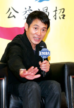 中新網6月3日電 據臺灣“東森新聞”報道,功夫巨星李連杰這次到臺灣不宣傳電影,他推廣的是一元行善;2日晚間他走進政大EMBA講堂,在臺灣的企業精英和教授面前,足足說了兩個小時,而且他有問必答,風趣的言談成功的把一元行善的想法,介紹給在場的政大師生。