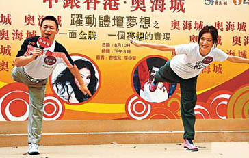 中新網(wǎng)8月11日電 容祖兒昨日與奧運(yùn)個(gè)人全能體操金牌得主李小雙擔(dān)任奧運(yùn)活動(dòng)嘉賓,李小雙當(dāng)場示范倒立,獲觀眾熱烈掌聲,他又教容祖兒做體操動(dòng)作。李小雙指中國很大機(jī)會(huì)拿體操團(tuán)體金牌,他估計(jì)中國會(huì)奪得30至36面金牌,體操占4至5面。