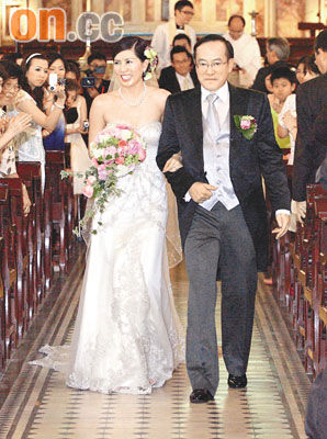 據(jù)了解,劉志敏昨晨接新娘時,除了闊綽地給五位數(shù)字開門紅包外,還與眾同樂,找出姐妹團預先收藏的“心心相印”兩顆心形貼紙,又以打油詩道出愛的宣言。雖然劉志敏身家豐厚,但對新娘相當細心。當兩人乘坐價值逾630萬元港幣的勞斯萊斯PHANTOM轎車抵達座堂時,他極有風度地主動為羅慧娟開車門,更為有聽力障礙的她安排貼身保鏢侍候在側,體貼無微不至。而羅慧娟身穿象牙白色低胸婚紗,配上珍珠及鉆石的頸鏈戒指,分外明艷照人。