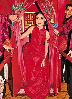陳慧琳昨以新嫁娘打扮,乘轎進場為喜餅廠商宣傳。