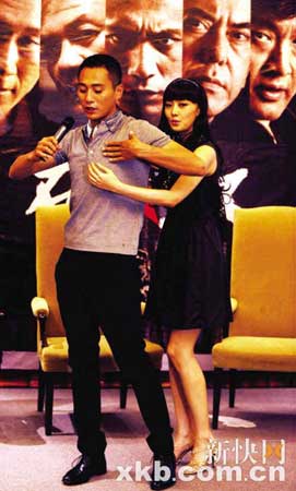 除了增重,劉燁還要犧牲色相。片花中他有一個背部全裸的鏡頭,劉燁說那個屁股真的是他的。而他和女主角還有一場在浴室里擁抱的戲。女主角劉洋說,因為劉燁那時候很大只,所以她兩只手還抱不過來,但現在就很容易一下子抱過來了。主持人趁勢就要求她現場示范一下,劉洋果然就從背后對劉燁“深情擁抱”,引來現場閃光燈一片。