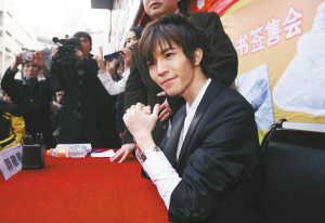 郭敬明一出現,粉絲們開始躁動,手機、相機照相的咔嚓聲和“不要擠不要擠”的尖叫聲此起彼伏。簽售正式開始。排在第一位的小女生飛快地沖了上來,她遞上了幫別人帶的禮物盒,興奮地看著“郭敬明”三個字落在書的扉頁上。女生還想讓郭敬明給自己寫一段話,只可惜沒能得逞,因為后面等候的人實在是太多了。