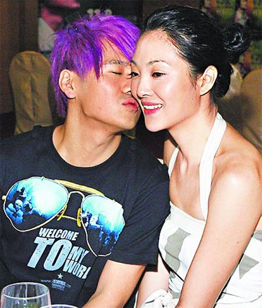 曹格(左)上月臺北演唱會結束慶功,親吻妻子吳速玲。