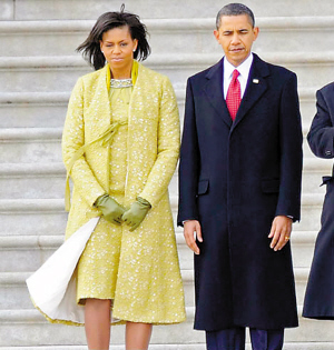 新任美國總統奧巴馬的妻子米歇爾在典禮上的穿著,時尚界評價不一,設計師托雷多說,黃色并非政治場合的傳統顏色,不過它傳達了希望與樂觀的意象。托雷多說,她是用瑞士羊毛蕾斯混法國絲的布料,裁制那套衣服,黃色代表陽光。