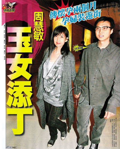 據昨日出版的某香港周刊爆料,周慧敏近日出席活動時被發現肚子凸起疑似有喜,而上周該周刊記者又在街上撞見她身穿孕婦裝偕夫出游,似乎新婚不足兩個月已“好事成雙”。有傳言指,原來在“倪震濕吻事件”發生后不久,周慧敏已發現自己“有喜”,這才是令倪震戲劇性浪子回頭的最大原因。