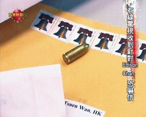 前晚,香港有線電視收到一封寄自美國的恐嚇信,內里除一粒子彈外,還附有一封針對陳冠希的恐嚇信件,警告他自4月4日后不要再出席任何公開活動,否則將危害其人身安全。昨天,陳冠希的老板林建岳接受記者采訪時表示,不會擔心陳冠希的安危。陳冠希自己也不懼“子彈”,將出席《神槍手》4月在新加坡的首映禮。