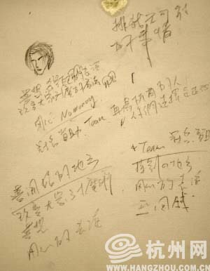和所有的新聞發布會一樣,劉謙的新聞發布會也有冗長的各贊助商發言時間。從臺下看,劉謙在贊助商發言時間一直很認真地在記筆記,而事實上,他和每一個在無聊會議上的人一樣,認真地在紙上亂涂亂畫:一個小小的自畫頭像,幾行無意義的漢字,還有一處寫著“No money”,就是這位魔術師的會議筆記。