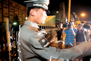 今晨3時,一輛警車開出大門右拐彎之后停在了便道上。兩名保安下車后,打開后面的鐵柵欄門,放出兩男一女。早已疲憊的記者們頓時從門口的臺階上跳起來,跑到警車后面,閃光燈閃個不停。