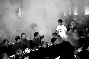 11時許,委員們攜手走進了基地內仿制的“中南海懷仁堂”,這里的道具都是模仿當年的真實場景設置,包括桌上的水杯、文件封面。邁進“會場”,大家表情嚴肅了許多,已連續3屆當選政協委員的徐定茂回憶,自己第一次走進人民大會堂履職時,心情也非常激動,“第一屆會議具有特殊意義,可想當年委員們的心情。”在導演的指揮下,委員們落座,投入“默哀”、“選舉”等場景的拍攝中。記者傅沙沙