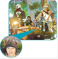 臺灣“蘋果日報”消息,《熊貓人》2名男主角都是周董力挺的好友宇豪與彈頭,女主角則是“新版J女郎”江語晨,全是一家親。該劇日前在大直美麗華取景,他們戲服頗有卡通味,其中彈頭白汗衫配披風,頂著金毛佩戴熊貓面具,不像“熊貓人”,反倒像“金毛獅王”,騎的是復古偉士牌機車;相較之下,與他對戲的演員身穿特制的熊貓俠裝,騎的是周董山寨版蝙蝠機車,看起來還比較像真正的熊貓人。
