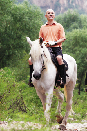 練騎馬是《讓子彈飛》演員的必修課。前段時(shí)間,廖凡、邵兵等人已經(jīng)進(jìn)組練習(xí)“馬戰(zhàn)”,現(xiàn)在終于輪到了葛大爺。葛優(yōu)的打扮十分休閑,T恤短褲輕松上陣,只是腳下長(zhǎng)長(zhǎng)的馬靴暴露出他還是為騎馬做了一番準(zhǔn)備的。上馬前,葛優(yōu)還對(duì)工作人員開(kāi)玩笑地說(shuō),他以前騎過(guò)馬,只是現(xiàn)在生疏了。盡管教練特地挑了一匹性格溫順的白馬,但剛騎上馬背的葛優(yōu)還是顯得有些緊張。戴著白手套的雙手緊緊抓住韁繩,眼睛緊盯著地面,不敢抬頭。但很快,葛優(yōu)在一名助手、兩名教練的前后護(hù)衛(wèi)下逐漸放開(kāi)膽子,催馬慢跑起來(lái),隨著馬跑的節(jié)奏晃動(dòng)身體,還有閑情抬頭看看山景,臉上也多了笑容,看來(lái)很快葛大爺就能在馬上跟姜文一決雌雄了。
