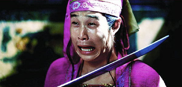 在影片中小沈陽出演的是一面館小伙計,雖然身量“弱不禁風”,但卻對武功特別癡迷,小沈陽說:“這是一挺陽光的小伙,平時好說好鬧,他爸爸是個殺豬的,挺有錢,他一門心思地練武功,自詡為‘武林中人’。”有趣的是小沈陽的造型,絕對稱得上是“嬌艷”,不是小紅襖里配個紅布兜,就是翠生生的綠長袍,再配上他那幾下花拳繡腿,不等說臺詞就能讓人樂噴了。看來張藝謀也充分發掘了小沈陽“男扮女裝”的表演特色,他在評點這個人物時自己更笑不攏嘴,“他造型簡直像新版‘西門慶’,服裝的效果讓他很‘水靈’,而他的表演最有特點的就是眼睛。”小沈陽自稱塑造了有史以來最經典的“俠客”形象,他在片場常念叨的搞笑臺詞是:“我是令狐沖的弟弟——大蔥。”