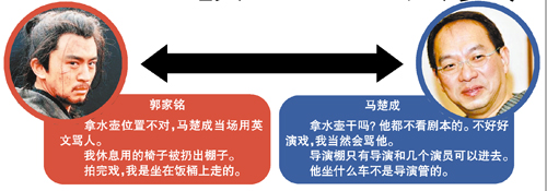 馬楚成感嘆說:“我入行多年,合作過那么多的演員,從來沒有投訴過我。我為什么說他,他是我遇到過的最差的演員。說他坐送飯的車離開片場,你覺得導演可以管得到一個演員坐什么車嗎?這不是導演管的事情。至于郭家銘投訴自己的椅子被扔的事,馬楚成笑道:“在片場為了保證拍片的秩序,導演棚只有導演、副導演和幾個演員,比如趙薇和陳坤可以進去看,但他非要沖進來,還跟工作人員吵架。算了,你就直接說我不作回應好了,我作了回應回頭還要說我幫他炒作呢。”記者周昭