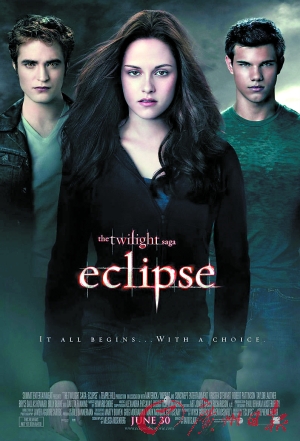 《暮光之城3:月食》將在今年6月30日登陸北美院線。《暮光之城》是最近三年好萊塢最紅的商業系列電影之一。峰會影業2008年推出第一集時,只用3500萬美元就收回了1.9億美元。去年的第二集則打破了多項首映周票房紀錄,全球累計票房高達7億美元。(余樂)
