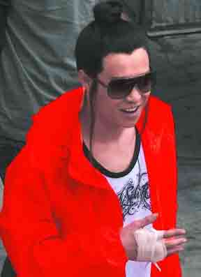小沈陽穿著一件鮮亮的橙色外套,里面是一件隨意的白色T恤,臉上已經(jīng)化好妝,戴著墨鏡,而不是大家常見的黑框眼鏡,乍一看還真有點(diǎn)認(rèn)不出來。小沈陽的古裝頭套已經(jīng)戴好,只是一個(gè)簡(jiǎn)單朝上梳的發(fā)髻,不過鬢角兩側(cè)還特地留了兩縷長長的頭發(fā)。記者一眼就發(fā)現(xiàn),小沈陽的右手不自然地舉在小腹前,還用白色的紗布進(jìn)行了包扎,肯定是受傷了。不過小沈陽的心情看上去好極了,他先是哼歌,后來見記者追問拍戲感受,他便取下墨鏡,反問記者是哪里人,不過面對(duì)“第一次和張導(dǎo)拍戲的感覺怎么樣”的問題,小沈陽只是微笑,并不回答。