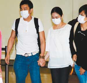 晚10時半左右,劉、朱飛抵香港,上百媒體及fans“急撲”機場一探究竟。當閘口打開,遭媒體圍攻的華仔不愿松開朱麗倩的手并一起步出機場,為保護朱麗倩不被人群撞倒,華仔更騰出另一只手摟著朱麗倩,二人寸步不離,非常恩愛。接著,華仔與朱麗倩在幾名保安及警員保護下匆匆離開,不過由于場面極度混亂,其間不時有人跌倒及出現(xiàn)掉鞋子的狀況。