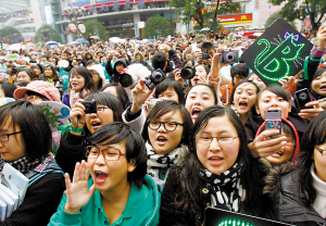 本報訊 山城昨日陰雨綿綿,不過這絲毫沒有影響到周筆暢的人氣。從中午開始,觀音橋茂業百貨外的簽售現場就聚攏起了四面八方趕來的筆迷。現場足有近二千人,超過上一次古天樂在同一地點簽售時的狀況。