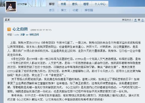 中新網12月29日電 曾因“間諜門”一事淡出熒屏的央視主持人方靜,上周再次出現在CCTV10《綠色空間》節目中,昨日(28日),方靜在博客中袒露心聲,表示自己在“間諜門”后一直在家寫歌療傷,更與大家分享自己創作的《心之歸所》這首歌。