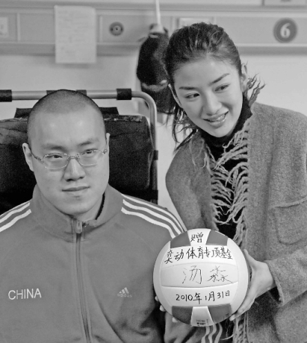 為了感謝黃奕,湯淼執意要贈送她一個親筆簽名的排球。黃奕拿著排球,湯淼左手握著筆,憑著前臂的力量用左手在排球上吃力地簽上了自己的名字。
