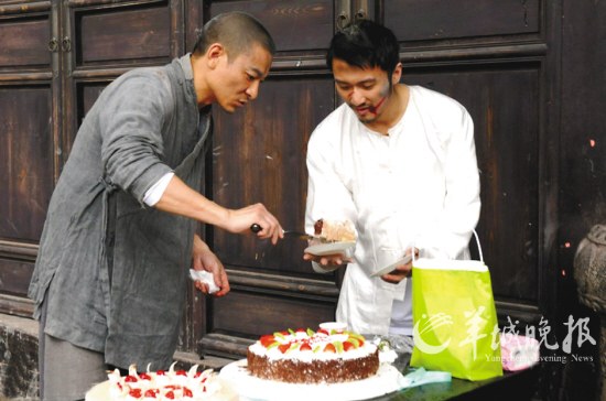 在今年的金像獎上捧獎后,謝霆鋒日前趕返橫店繼續開工,而導演陳木勝和劇組特別在《新少林寺》的拍攝場地為他準備了一個迷你慶祝會,并送上兩個分別寫上 “雙喜”和“臨門”的蛋糕,祝賀他贏得最佳男配角獎之余,還即將第二次榮任爸爸。不過,慶祝會上最令謝霆鋒雀躍的是,他的偶像劉德華專門為他打氣,勉勵他明年要向最佳男主角獎項邁進。